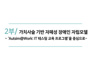 해당 프로그램에는 소셜벤처 '모두다'와 '테스트웍스'가 참여하여, 자폐성 장애인이 사회성을 함양하고 전문성을 강화하는 집중 프로그램을 통해, 국내 최초로 'IT테스터'로서 자립할 수 있는 기본 잠재력을 확인했습니다.