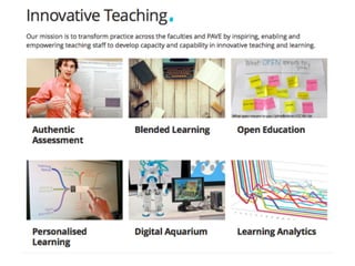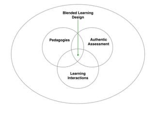 This document discusses Swinburne University's learning and teaching ecosystem, which aims to enhance the student experience through blended learning approaches. It identifies trends, challenges, and guiding pedagogies such as authentic and personalized learning. The ecosystem incorporates on-campus, online, and work-integrated learning. Educators are expected to align with the learning and teaching strategy and engage in professional development including compulsory graduate certificates in higher education units. Workshops are provided on learning design approaches including blended, authentic, and personalized learning.