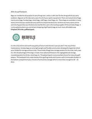 This document discusses different types of bags for carrying sports equipment, particularly disc golf bags. It notes that bags come in various styles, including carry bags, Sunday bags, stand bags, staff bags, travel bags, and more. The document then recommends the Throwback Sports 2016 disc golf backpack as an excellent choice for disc golf players. It notes that the backpack understands disc golfing needs with removable dividers, vertical disc storage for 20-25 discs, and lacks more advanced features found in other bag styles.