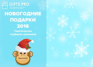 Документ представляет собой презентацию новогодних подарков 2016 года, включая бюджетные, стандартные и VIP сувениры от giftspro.ru. В нем представлены различные категории подарков, такие как брелоки, свечи, мыло и другие промо-сувениры с возможностью нанесения логотипов. Также перечислены преимущества компании и примеры упаковки, подчеркивающие важность оформления подарков.