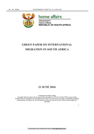 The document is a Green Paper on International Migration in South Africa published by the Department of Home Affairs. It aims to invite public comments on South Africa's international migration policy by September 30, 2016. Interested parties can submit written comments to the specified address or email. The Green Paper discusses the need for a new international migration policy, as the current approach has limitations. It outlines a vision for a balanced policy that maximizes the benefits of migration while minimizing the risks.