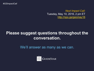 GuideStar held its quarterly Impact Call on February 9, 2016 to report on fourth quarter results and provide an outlook for 2016. Key highlights included:
