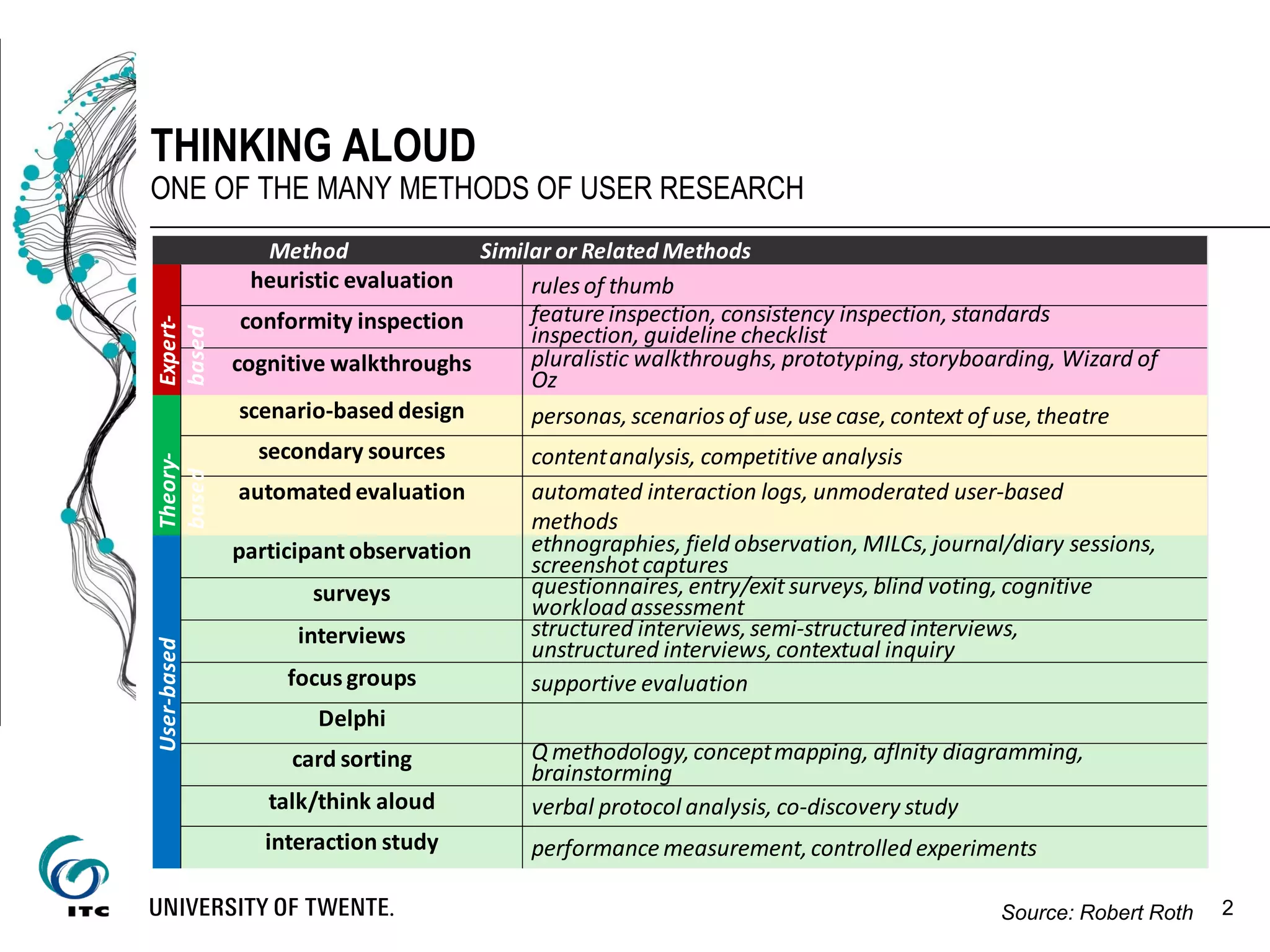 The document discusses the application of the think-aloud method in user and usability research within cartography and geographic information science, emphasizing the importance of user-centered design and various usability evaluation techniques. It highlights the advantages and disadvantages of the think-aloud method, outlining its ability to yield valid data but noting issues related to protocol analysis and participant comfort. Additionally, the text details the methodology for conducting studies, including qualitative and quantitative approaches, and recommends mixed-methods integration for comprehensive analysis.