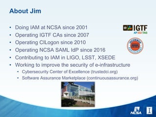 The document discusses challenges and strategies for managing identity and access on a global scale for research collaborations, emphasizing the importance of trust in external identity providers. It addresses operational gaps, unique needs for e-science identity management, and the necessity for scaling up from a few to thousands of identity providers while ensuring security and interoperability. Additionally, it explores identity assurance frameworks and the need for better practices in federating services across diverse institutions and commercial providers.