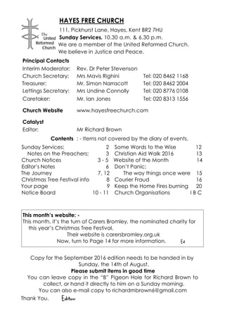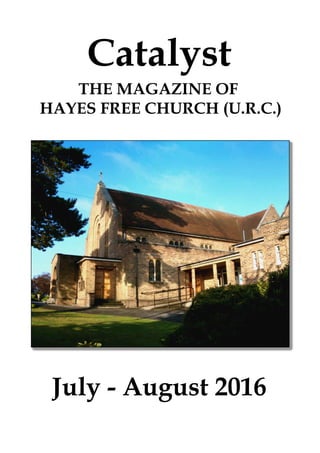 The document provides information about upcoming events at Hayes Free Church in July and August 2016, including notices about submitting articles for the September edition of the church magazine, Catalyst, details on visiting preachers, prayer meetings, women's and men's group meetings, and calls for a new editor for Catalyst.