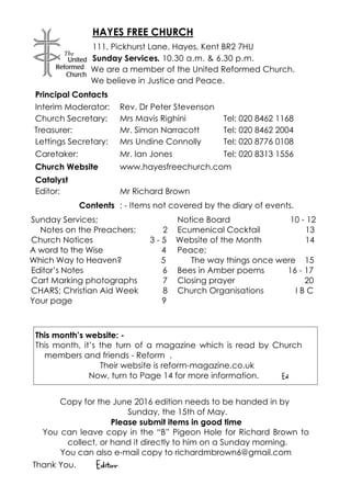This document is the May 2016 edition of the Hayes Free Church magazine. It provides information about upcoming services, events, and notices for the church community. Key details include the deadline of May 15th for submissions to the June magazine, notices about preachers and services in May, announcements of deaths and changes of address for church members, and schedules for various church groups meetings in May.