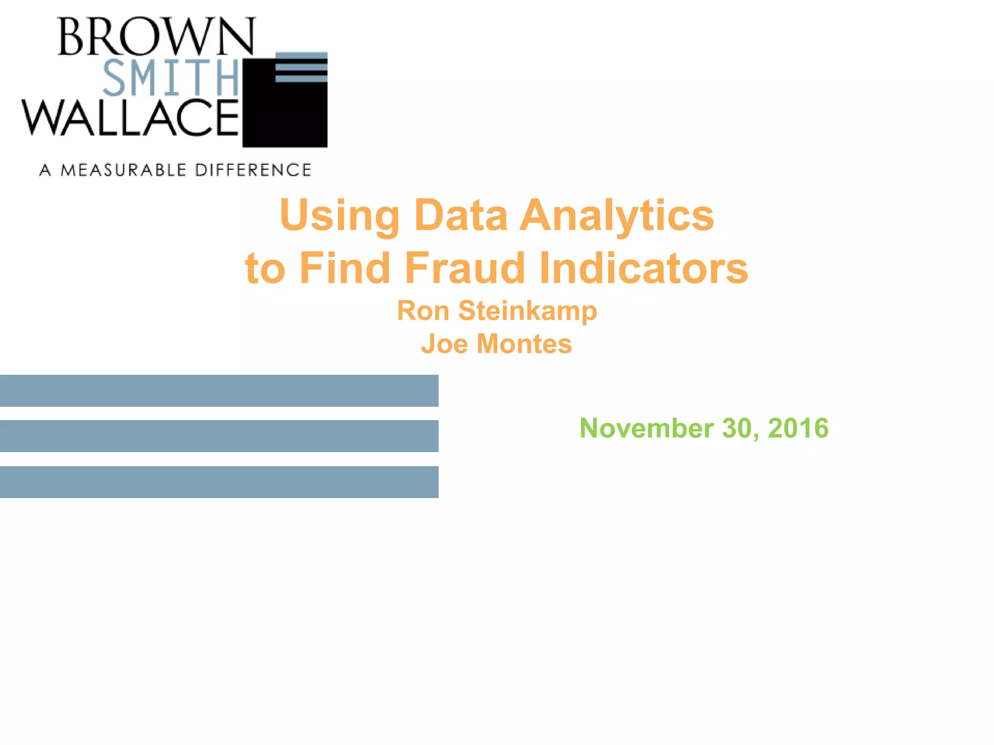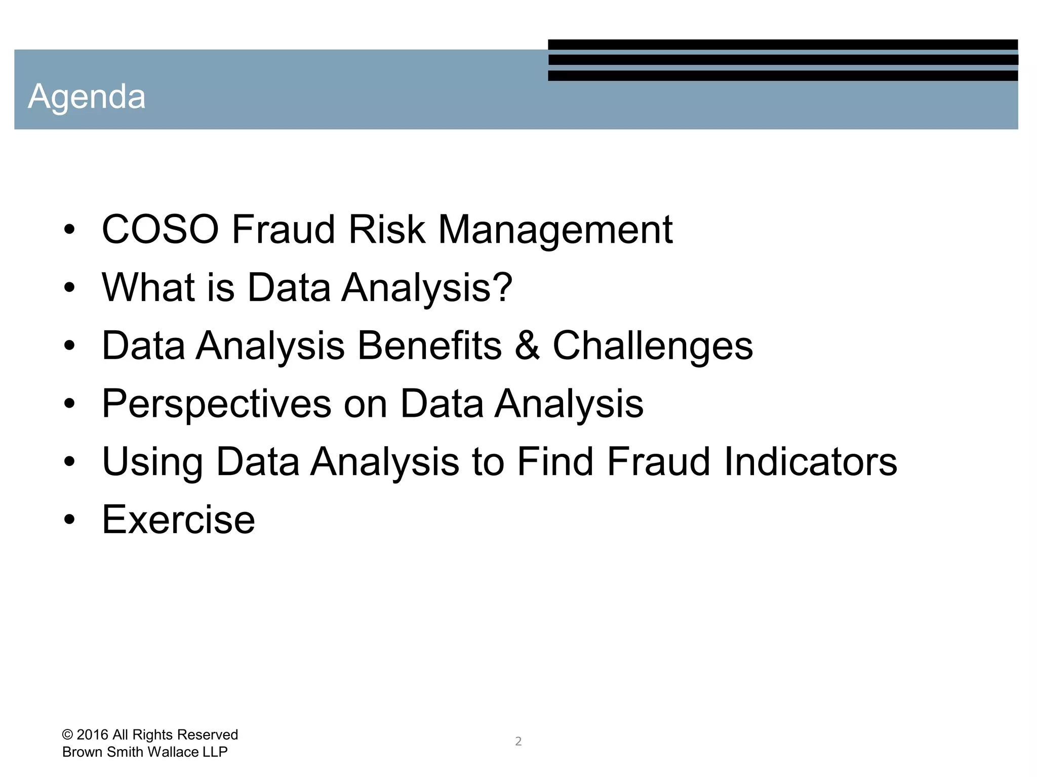 The document discusses using data analytics to identify fraud indicators. It provides an overview of COSO's fraud risk management principles and how data analysis fits within those principles. Several fraud risk areas are identified that are well-suited for data analytic techniques, including payroll, accounts payable, travel and entertainment, procurement cards, and foreign corrupt practices. Examples of specific fraud indicators that could be identified through data analysis for each risk area are also provided.