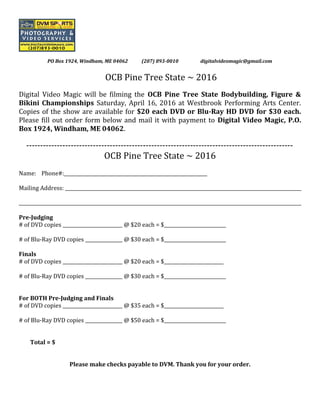 Digital Video Magic will film the 2016 OCB Pine Tree State bodybuilding competition on April 16th in Westbrook, Maine and offer DVDs and Blu-Ray discs of the pre-judging and finals for $20-30 each or $35-50 for a set. Customers can mail an order form with payment to the company's PO Box in Windham to purchase recordings of the event.