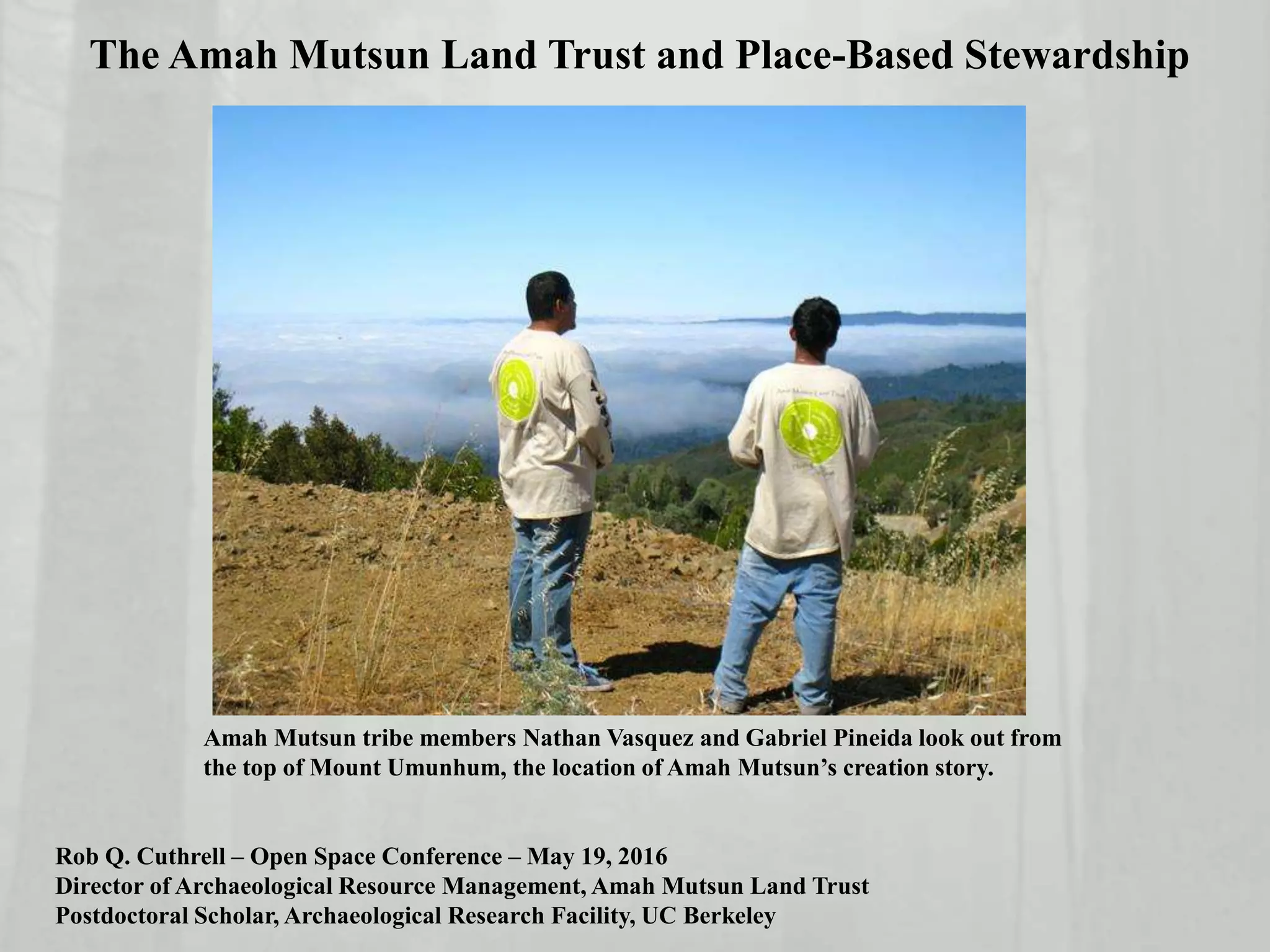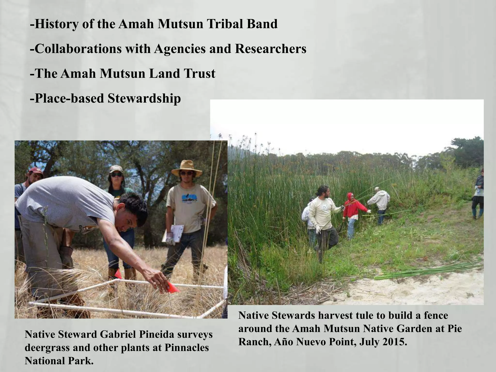 The document summarizes the work of the Amah Mutsun Land Trust and their place-based stewardship efforts. It discusses the history of the Amah Mutsun Tribal Band, their collaborations with agencies and researchers, and the formation of the Amah Mutsun Land Trust. It then describes some of the Land Trust's place-based stewardship projects, which involve Native Stewards conducting ecological restoration and cultural activities at sites like Pinnacles National Park, Quiroste Valley Cultural Preserve, and Pie Ranch to reconnect with and care for the land.