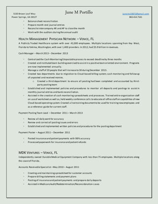 This document contains the resume of June M Portillo. She has over 15 years of accounting and finance experience in various industries including aerospace/defense, healthcare, government, and automotive. Her most recent role is Assistant Controller for Precision Aviation Group, where she oversees financial reporting, process improvements, and a team of 10 accountants across multiple locations.