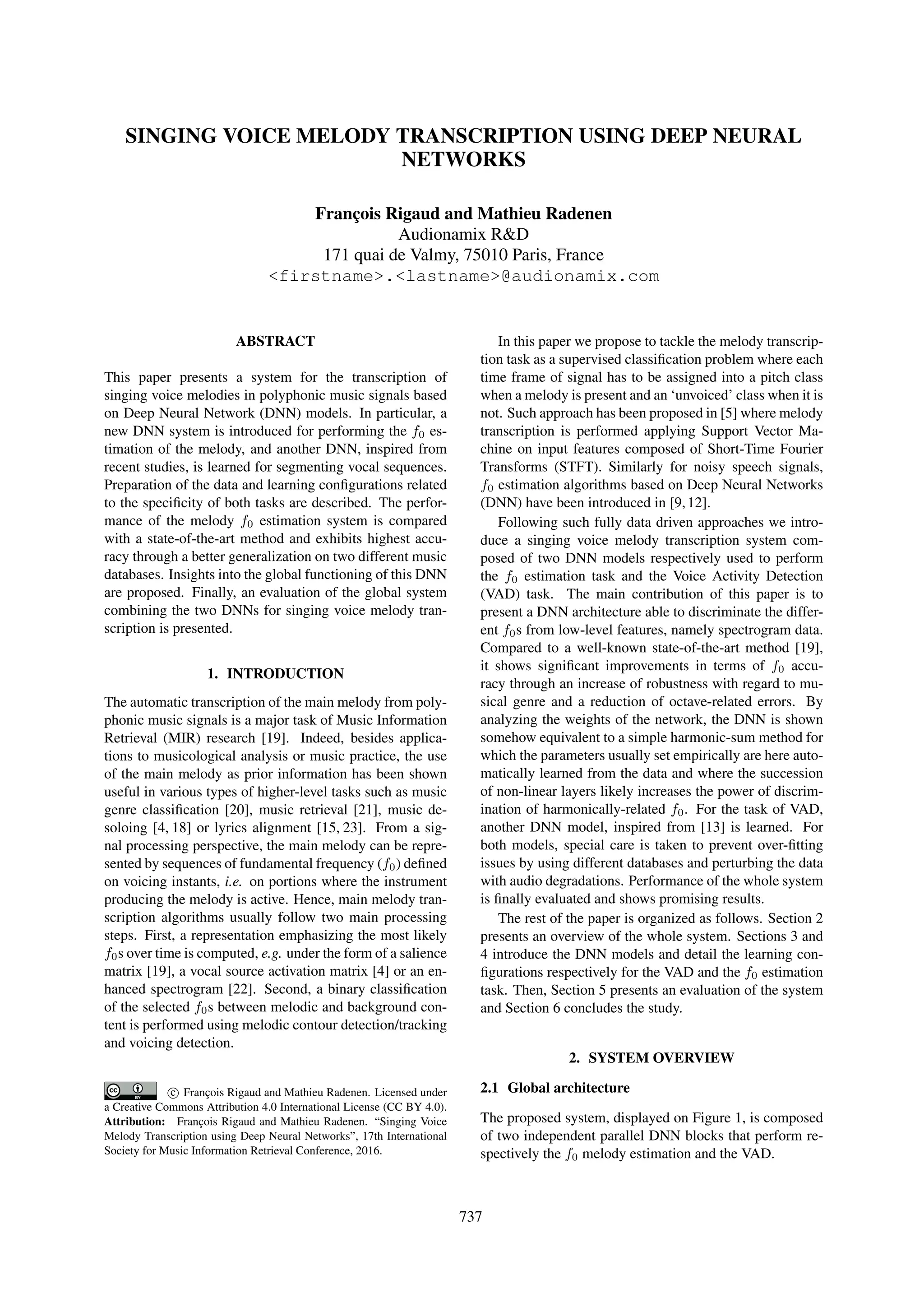 This document presents a system for transcribing singing voice melodies from polyphonic music signals using deep neural networks (DNNs). It introduces two DNN models: one for fundamental frequency (f0) estimation of the melody, and another for voice activity detection. The f0 estimation DNN takes log-spectrograms as input and classifies each time frame into one of 193 pitch classes or an unvoiced class. It achieves higher accuracy than a state-of-the-art method through better generalization across genres and reduction of octave errors. The system evaluates the DNNs on various music databases and shows promising results for singing voice melody transcription.