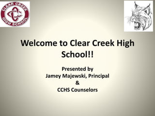The presentation provided Clear Creek High School students and parents information about course registration for the upcoming school year. It reviewed graduation requirements, endorsement options, AP and pre-AP courses, the course selection process using online tools, and important deadlines. Students were encouraged to choose their courses carefully with their future goals in mind and select alternate courses in case their first choices were not available.