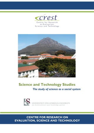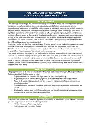 The document provides information about postgraduate programmes in Science and Technology Studies offered by the Centre for Research on Evaluation, Science and Technology at Stellenbosch University. It describes the MPhil and PhD programmes, including admission requirements, modules, assessments, and application processes. The MPhil consists of coursework and a research report, while the PhD requires coursework and a thesis. The programmes examine science as a social system and consider topics such as the sociology of science, science policy, gender and science, and knowledge production in Africa and South Africa.