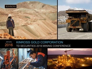 Kinross Gold Corporation presented at the TD Securities 2016 Mining Conference in January 2016. The presentation focused on Kinross' principles of operational excellence, quality over quantity, disciplined capital allocation, and maintaining a strong balance sheet. It provided updates on Kinross' diversified portfolio of operating mines and organic growth opportunities, including positive pre-feasibility study results for the La Coipa Project and concepts for a phased expansion at Tasiast.