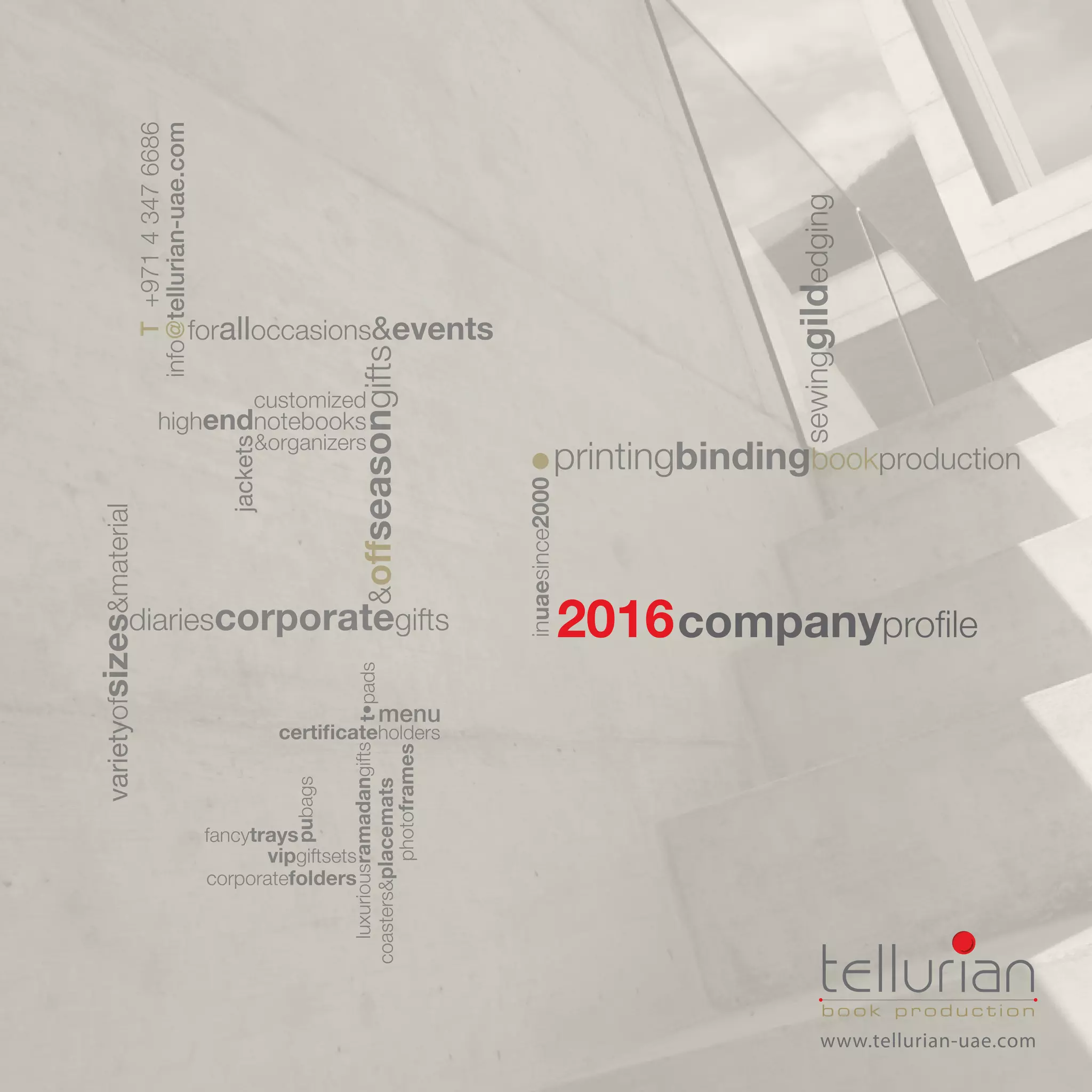 Tellurian Book Production, established in the UAE since 2000, specializes in designing and producing customized diaries, notebooks, and corporate gifts suited for various occasions and branding needs. The company provides a wide range of high-quality products including desk planners, calendars, and luxurious gift sets, catering to clients from diverse sectors like banks, hotels, and government offices. All products are crafted in Dubai, ensuring high standards and customization options to leave a lasting impression on clients.