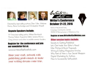 The document outlines the schedule for a writing conference held on October 21-22, 2016, featuring various sessions on topics such as writing techniques, publishing options, and marketing strategies. Notable sessions include discussions on maximizing writing potential, crafting nonfiction, self-publishing, and utilizing social media for writers. The conference also included keynote speeches and an open panel with industry professionals.