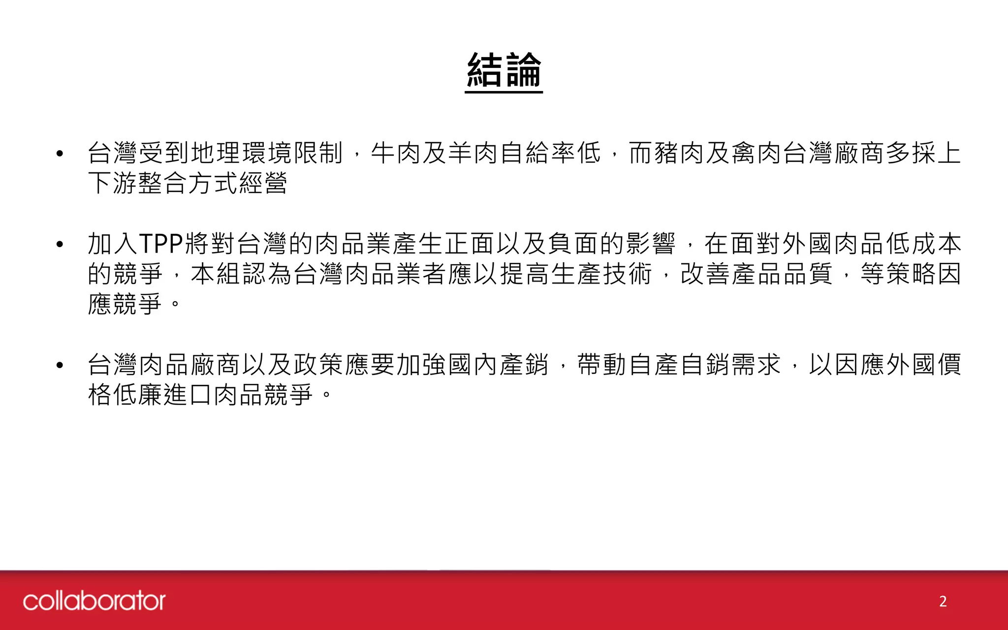 台灣肉品業受到地理環境限制,牛肉與羊肉自給率低,而豬肉及禽肉則採用上下游整合方式經營。加入TPP對肉品業有正面和負面影響,業者應提高生產技術和產品品質以應對外國競爭。台灣肉品廠商需強化國內產銷,促進自產自銷需求,以應對進口肉品的低價格競爭。