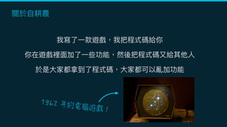 This presentation discusses open source software. It provides a brief history of open source including Unix in the 1970s, GNU in 1983, Linux in 1991, and Netscape in 1998. It describes features of open source like copyleft and various open source licenses. The presentation emphasizes that open source code does not guarantee good software - it is the skills of the programmers that determine quality - and contributing to open source benefits both the community and allows individuals to improve their skills.