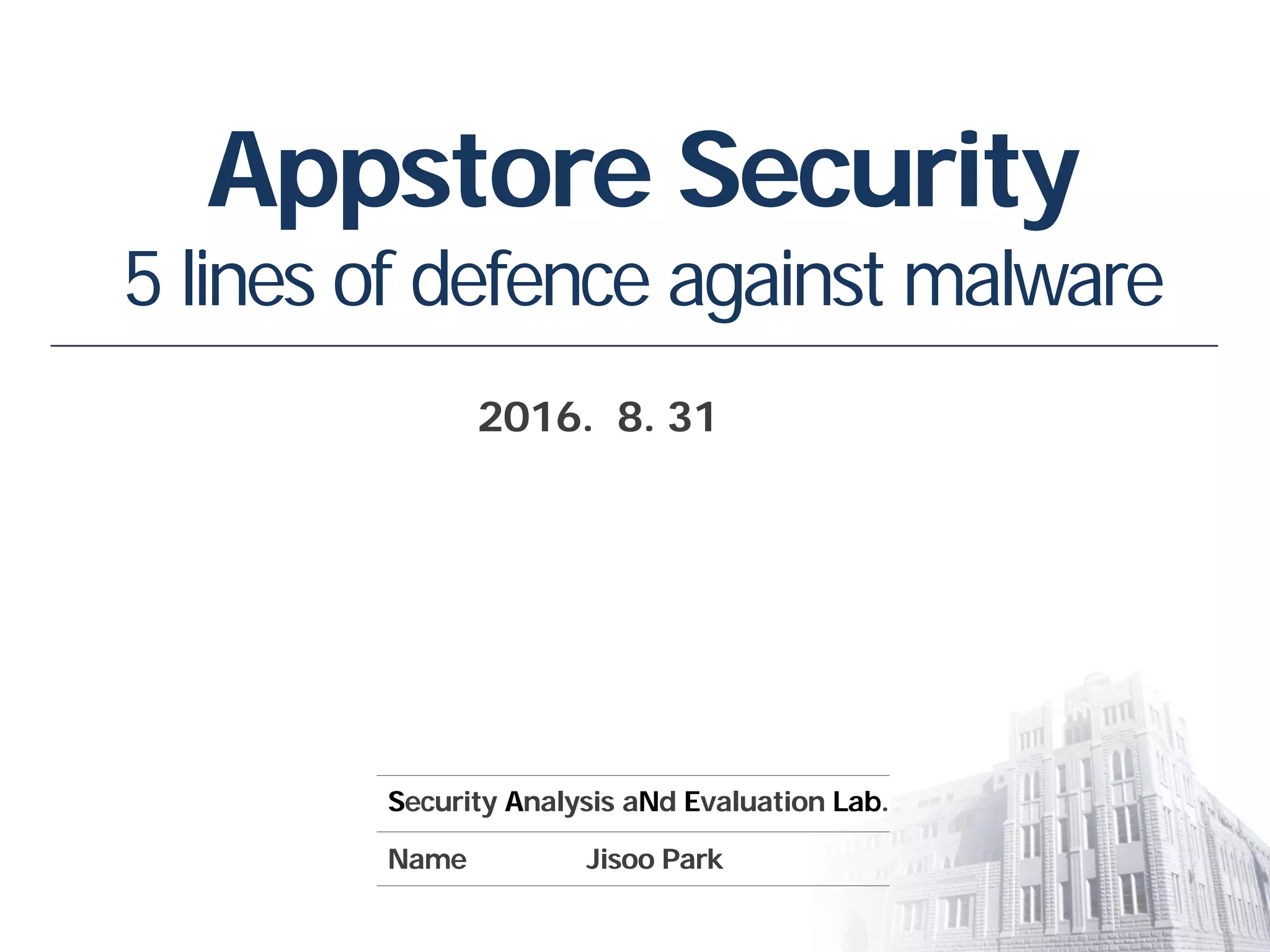 This document provides an overview of strategies to defend against malware threats in mobile app ecosystems. It begins with a data flow diagram that maps the flow of data and processes. It then discusses an attacker model and uses STRIDE threat analysis to evaluate spoofing, tampering, repudiation, information disclosure, denial of service, and elevation of privilege threats. Finally, it proposes five lines of defense: app review using automated and manual analysis, reputation mechanisms based on app history, app revocation, device security features, and walled gardens/jails that restrict apps.