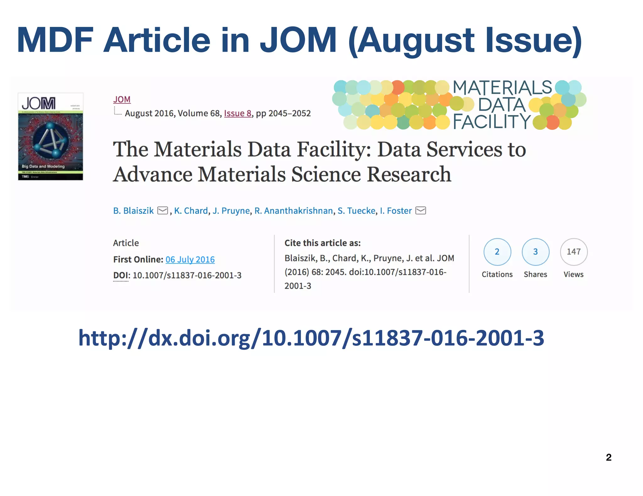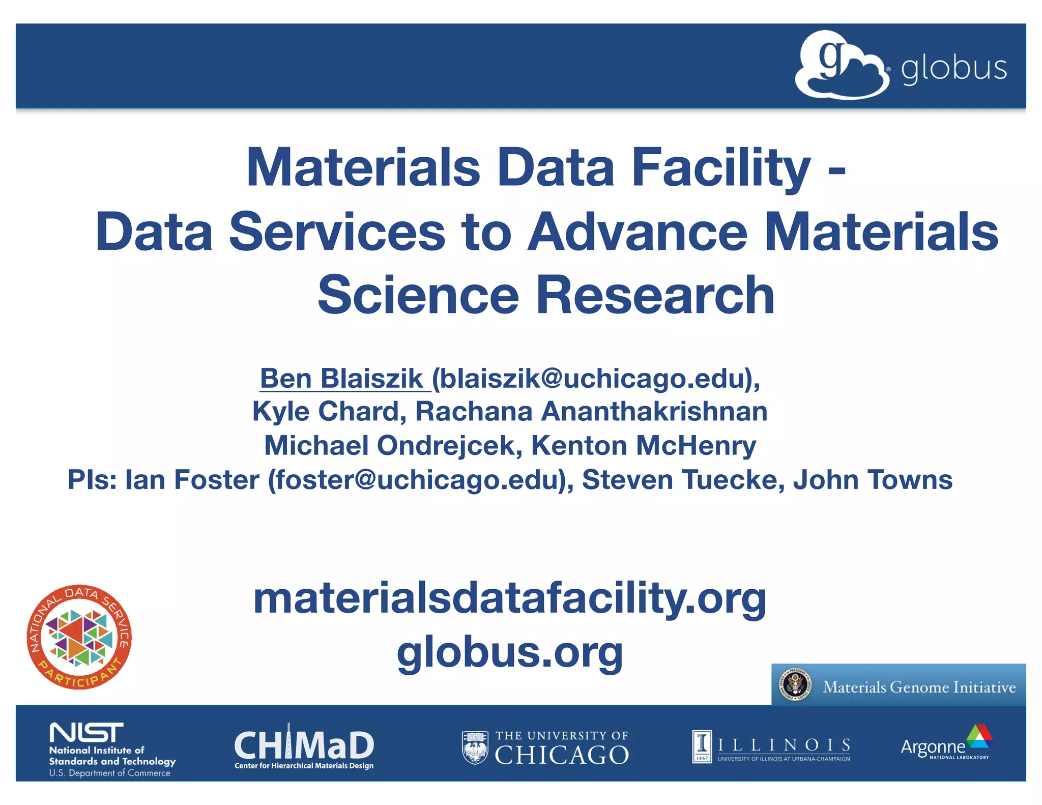 The document outlines the development and features of the Materials Data Facility (MDF), which aims to simplify the publication, discovery, and use of materials datasets through a series of APIs and cloud-hosted services. It discusses the challenges of materials data publication, including the need for unique identifiers, metadata schemas, and automated curation workflows. Furthermore, the MDF is positioned as a valuable resource for researchers, promoting data accessibility and collaboration in the materials science community.
