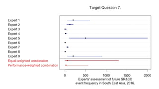 3) The results showed that weighting the experts by their performance on seed questions and combining their judgements produced a forecast that was better calibrated and more tightly estimated than either an equal-weighted combination or the forecasts of individual experts.