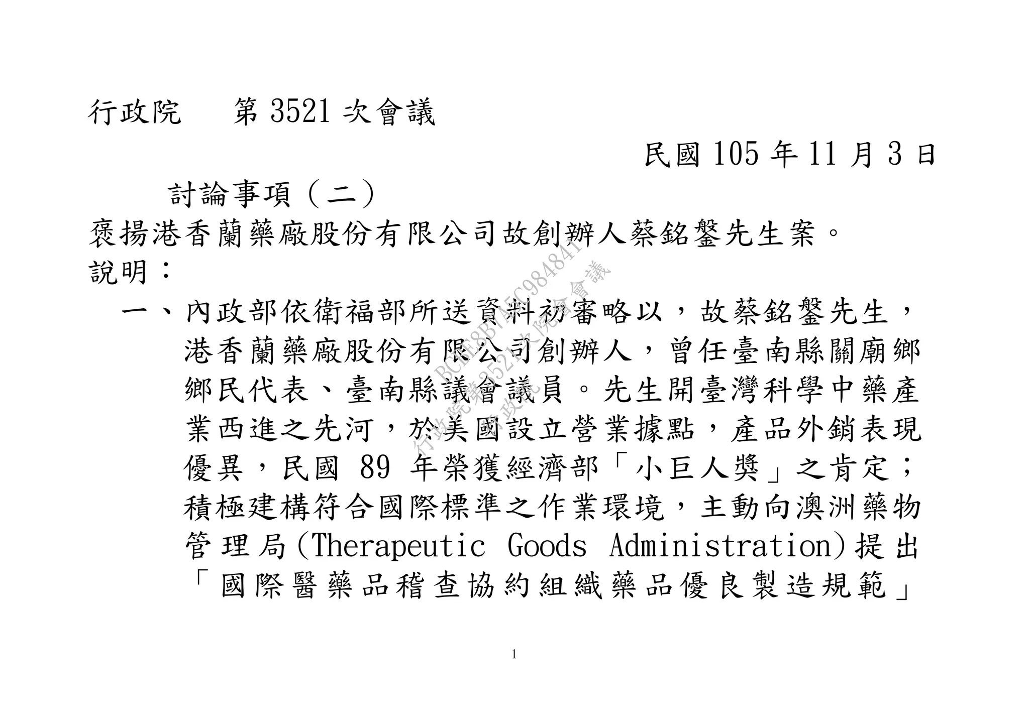 行政院讨论了褒扬港香兰药厂创办人蔡铭镛先生的议案。蔡先生在中药产业发展上有杰出贡献,不仅在美国建立营业据点,还推动技术研发和国际认证,曾获多项奖项及肯定。他在107岁逝世,生前致力于国际品质标杆的树立,符合褒扬条款,拟请总统明令褒扬。