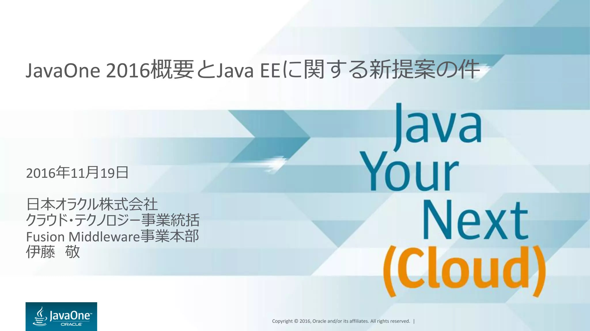 Oracle and/or its affiliates. All rights reserved. | JavaOne 2016概要とJava EEに関する新提案の件 2016年11月19日 日本オラクル株式会社 クラウド・テクノロジー事業統括 Fusion Middleware事業本部 伊藤 敬