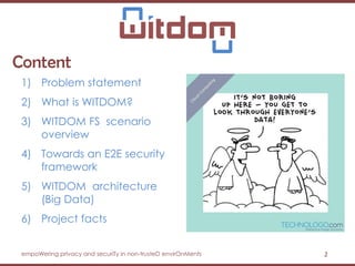 The document discusses the Witdom project, aimed at securing outsourced financial data in untrusted environments, specifically targeting the finance sector. It outlines a framework for end-to-end protection of data, detailing scenarios, legal and technical requirements, architecture, and anticipated outcomes over a three-year period starting in 2015. The project involves collaboration among seven organizations from five European countries, with a budget of 4 million euros supported by the EU's Horizon 2020 program.