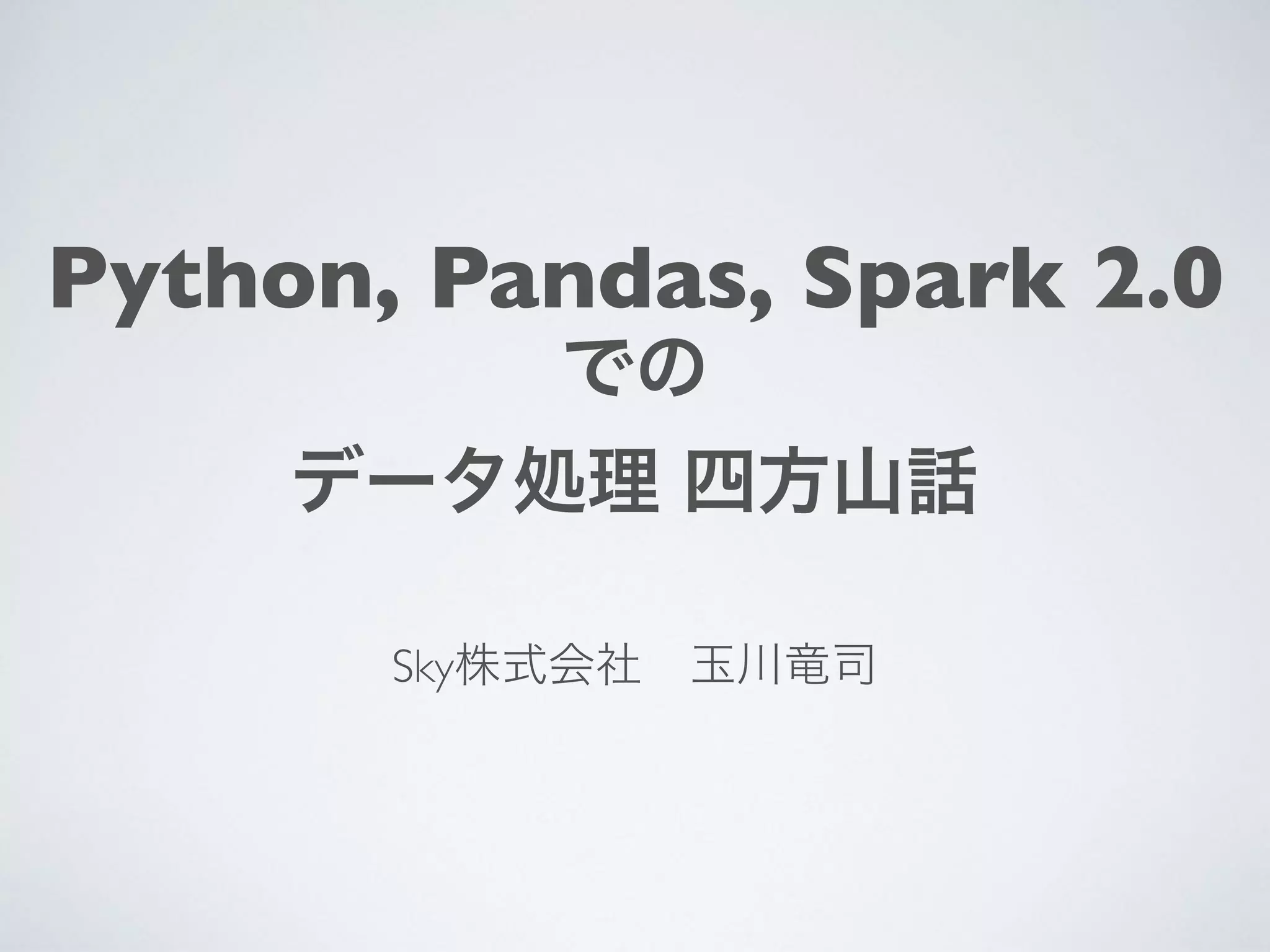 This document discusses using Python, Pandas, and Spark 2.0 for data analysis. It covers loading CSV and other data formats into Pandas and Spark DataFrames, using Parquet for efficient storage, and transferring data between Pandas and Spark for hybrid processing using CPUs and SSDs. The last part discusses new features in Spark 2.0 like SQL support on DataFrames and improved Python integration.