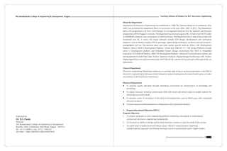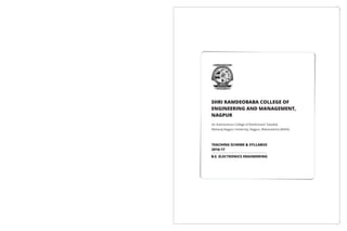 The document provides details about the Department of Electronics Engineering at Shri Ramdeobaba College of Engineering and Management in Nagpur, India. It includes information about the department's establishment, accreditation, programs offered, vision, mission, facilities, teaching scheme and syllabus for the Bachelor of Engineering in Electronics Engineering program. The department aims to provide state-of-the-art technical education and facilitate research in electronics engineering. It has 15 labs with over Rs. 2 crores invested in equipment and software. The teaching scheme outlines the courses, credits and examination scheme for each semester of the 4-year B.E. Electronics Engineering program.