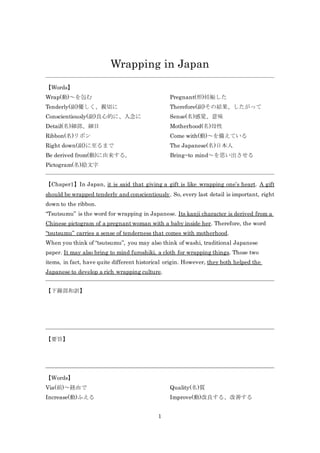 1. In Japan, wrapping gifts is seen as wrapping one's heart carefully and with attention to detail. The word for wrapping, "tsutsumu", comes from a pictogram of a pregnant woman, carrying the sense of tenderness of motherhood.