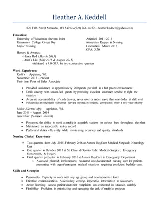 Heather Keddell has a nursing degree from Rasmussen College with a 3.7 GPA. She has worked as a point of sales associate at Kohl's for over two years with no complaints. She also has experience assembling at Miller Electric. Her clinical experience includes rotations in medical-surgical, neurology, emergency department, and surgery units. She is skilled in areas like communication, critical thinking, Spanish, accuracy, time management, and collaboration.