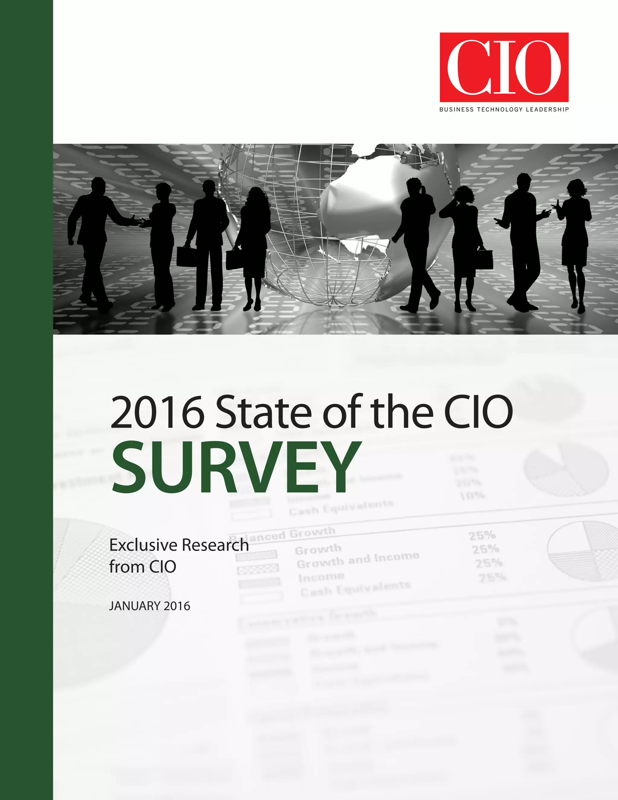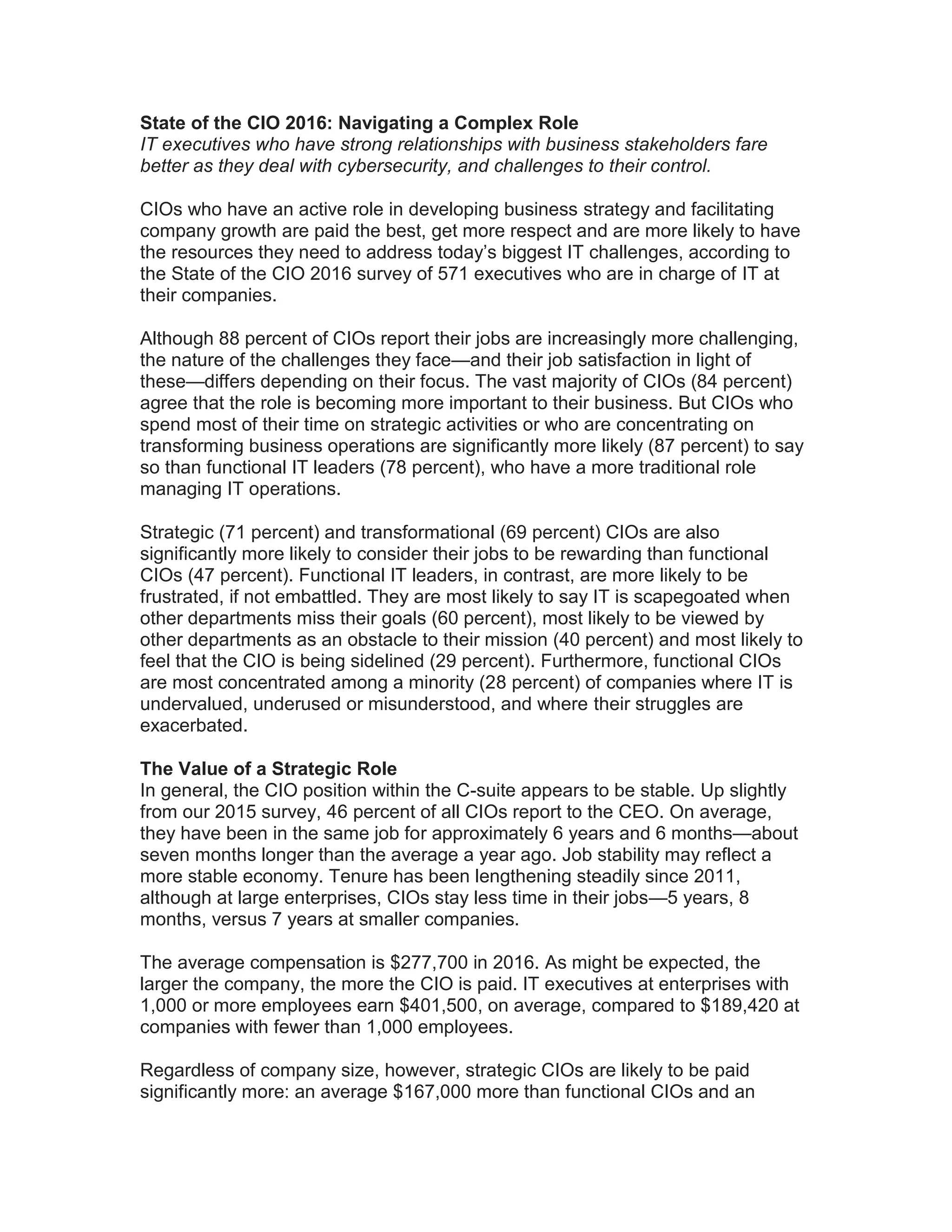 The document summarizes the findings of a survey of 571 CIOs about the current state of their role. It finds that CIOs who have more strategic, business-focused roles fare better than functional CIOs focused mainly on IT operations. Strategic CIOs earn more money, have more job satisfaction, and are better able to address challenges like cybersecurity. While most CIOs say their jobs are challenging, strategic CIOs find their work more rewarding. The survey also shows CIOs are increasingly focusing on security issues due to high-profile data breaches.