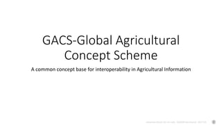 GACS (Global Agricultural Concept Scheme) is a project between FAO, NAL, and CABI to create a common base of agricultural terms by merging and mapping their thesauri. Currently it contains a core of around 13,000 commonly used terms. The goal is for all data repositories to be open and interoperable by linking terms and concepts between different knowledge organization systems using GACS as a common reference point. Ontologies and thesauri can consult GACS when being developed to reuse existing related terms and concepts, and add new terms to GACS if they are commonly needed.
