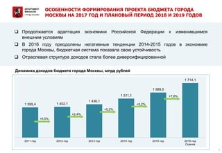 Документ описывает проект закона о бюджете города Москвы на 2017 год и плановый период 2018-2019 годов, акцентируя внимание на динамике доходов, налоговых изменениях и социальной направленности бюджета. Прогнозируется рост доходов до 1,939.9 млрд рублей к 2019 году, с значительной долей социальных расходов и инвестиционных программ. Учитываются изменения в налоговом законодательстве и структура доходов, направляемых на выполнение социальных обязательств города.