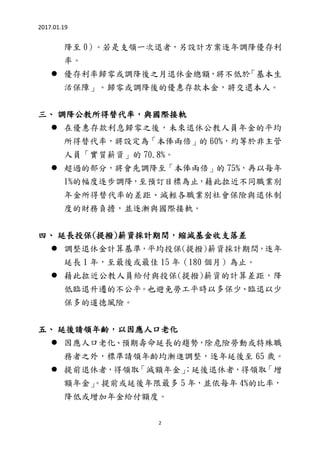 2017年年金改革方案旨在确保年金制度的财务健康与可持续,保障老年生活和职业间的公平。改革包括终止18%优惠存款制度、降低公教人员所得替代率、推迟退休年龄等,旨在应对人口老龄化和优化基金管理。政府将增加资金注入并推动年金年资可携带制度,以提升整体退休金的公平性与合理性。