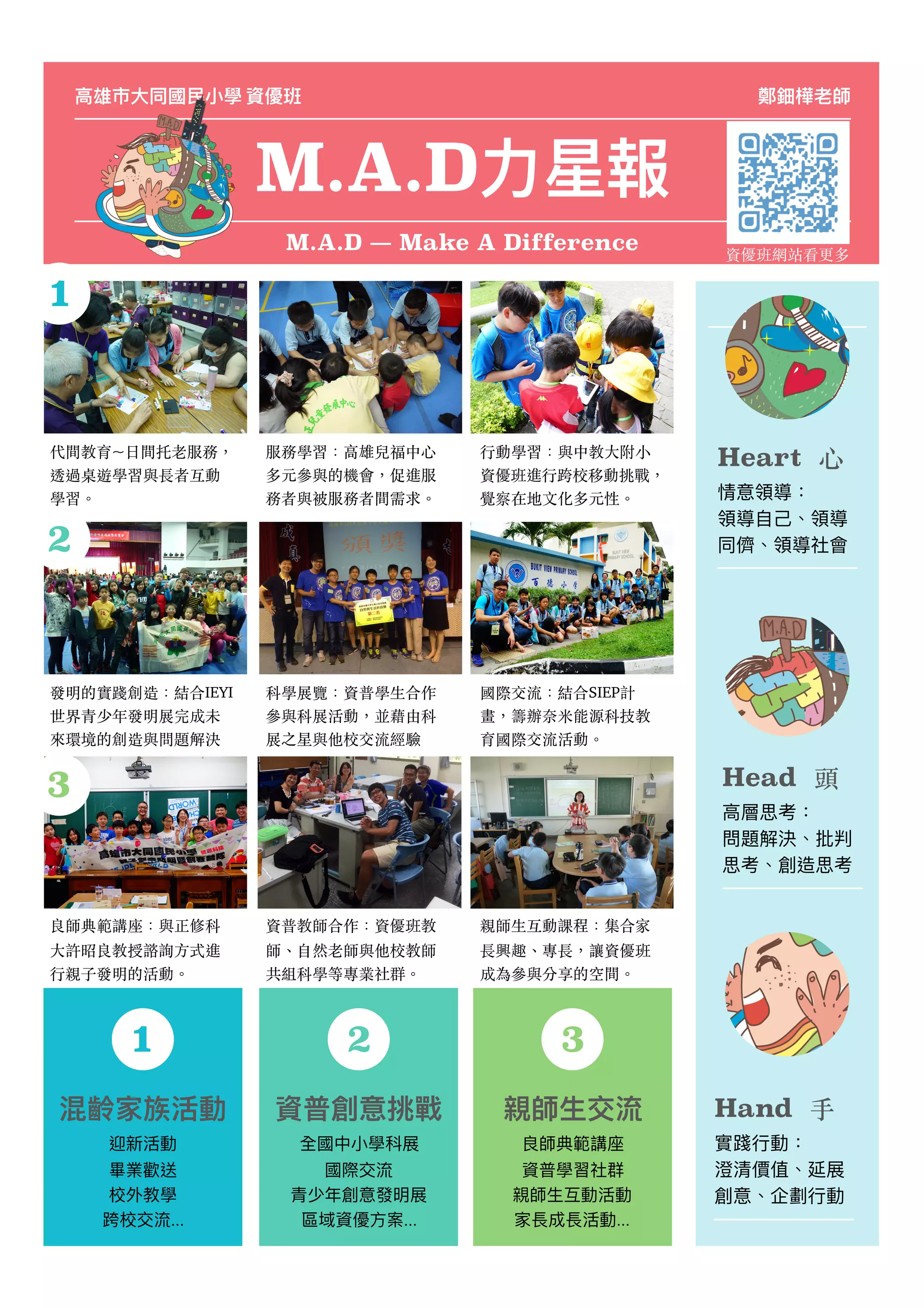 文档介绍了高雄市大同国民小学资优班的各类活动与课程,包括混龄家族活动、国际交流和服务学习。郑钿华老师带领的资优班通过多元的实践与创造性课程,强化学生的批判思维和领导能力,并参加了多个国内外的竞赛与交流。该班致力于满足学生的兴趣和需求,提供个性化的教育体验。