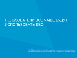 Документ посвящен юзабилити и функциональности дистанционного банковского обслуживания (ДБО) в 2017 году, с акцентом на рост популярности банковских карт и электронных платежей. Он содержит анализ частотности выполнения задач в приложениях и интернет-банках, выделяя ключевые функции и успешные решения. Также представлены данные о юзабилити-рейтинг, необходимость вовлечения клиентов и ряд мероприятий компании UsabilityLab.