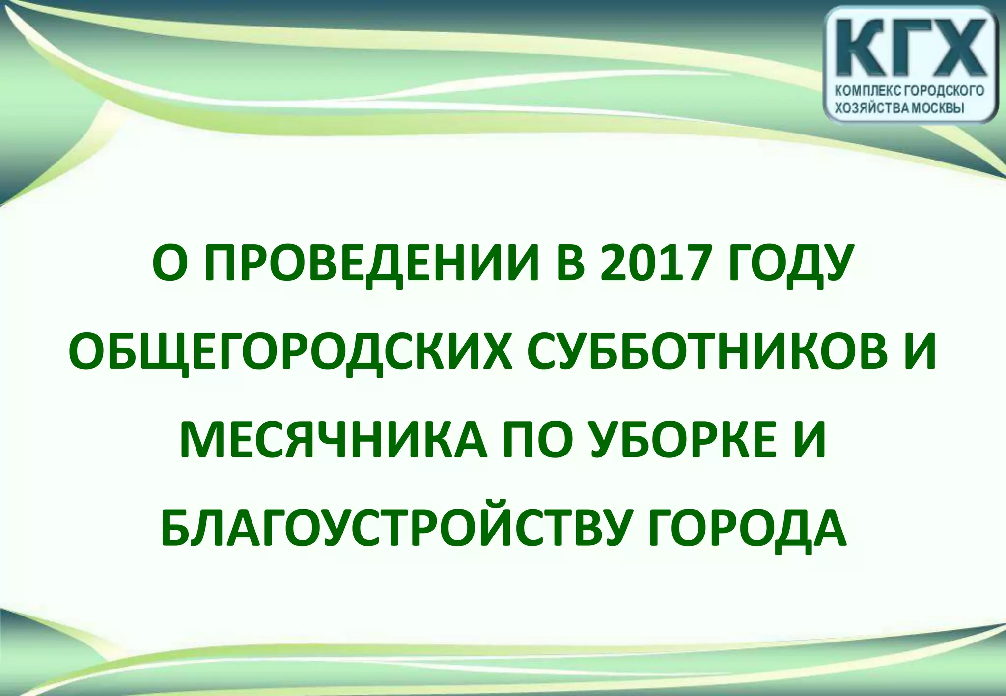 В Москве с 25 марта по 29 апреля 2017 года запланирован месячник по уборке и благоустройству, включая общегородские субботники. В рамках мероприятий проведены работы по благоустройству различных городских территорий, ремонту дорог и очистке городской инфраструктуры. Кроме того, запланированы дополнительные работы по озеленению и приведению в порядок памятников и захоронений.