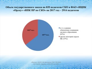 Документ содержит статистические данные о курсовой подготовке педагогов в Северно-Казахстанской области за январь-март 2017 года, включая количество педагогов, прошедших курсы как по государственному заказу, так и на договорной основе. Общее количество педагогов, участвовавших в подготовке, составило 517 человек, что составляет 58,09% от общего контингента. Также рассматривается организация учебного процесса в режиме смешанного обучения для различных категорий педагогов.