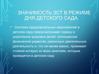 Документ описывает значение здоровья сберегающих технологий в режиме дня детского сада, акцентируя внимание на важности физической активности для укрепления здоровья детей. Упоминаются различные мероприятия, такие как утренняя гимнастика, физкультминутки и подвижные игры, которые способствуют эмоциональному и физическому развитию детей. Также рассматриваются упражнения для глаз и дыхательные практики, необходимые для полноценного развития и профилактики заболеваний.
