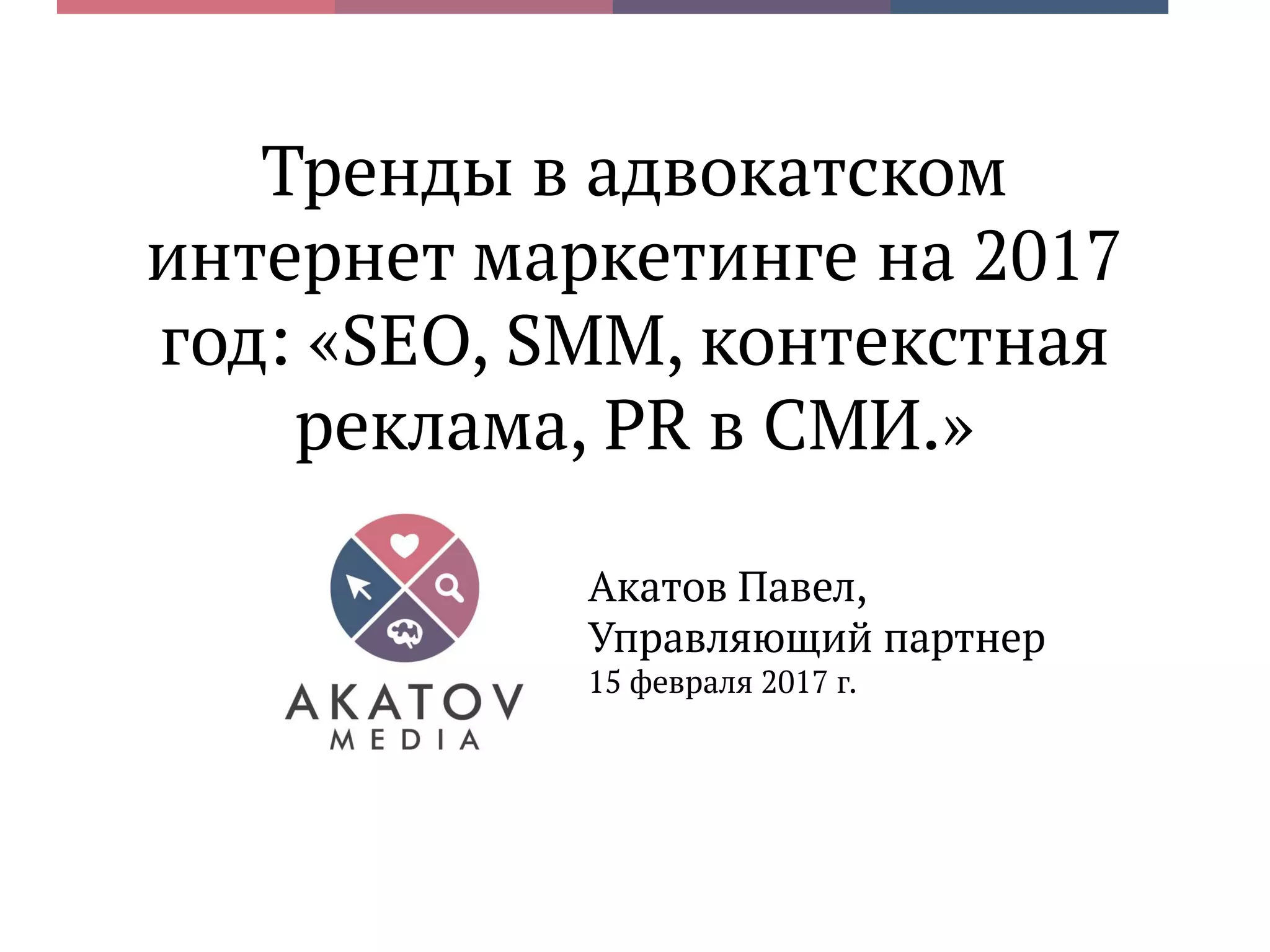 Документ описывает тренды в адвокатском интернет-маркетинге на 2017 год, акцентируя внимание на SEO, SMM, контекстной рекламе и PR в СМИ. Он подчеркивает важность использования новых технологий для выделения на фоне конкурентов и улучшения клиентского опыта через мобильную версию сайтов и интерактивные элементы. Приведены примеры успешных адвокатских сайтов и кейсы, демонстрирующие рост трафика и прибыль через грамотную стратегию маркетинга.
