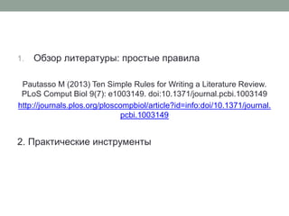 Документ представляет собой руководство по написанию обзоров литературы, включая определение тем, аудитории и типов обзорных работ. Он подчеркивает важность систематического и критического подхода, а также уточнения основных вопросов и структуры обзора. В заключение, авторы отмечают, что качественный обзор создает добавочную ценность и вдохновляет на новые исследования.