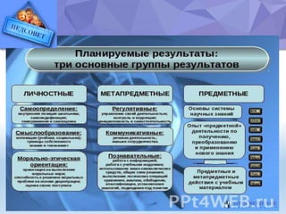 Документ содержит обновления и цели внедрения новых образовательных стандартов в школе, направленные на знакомство педагогов с основами и результатами госстандарта основного общего образования. Внедрение новых стандартов предполагает изменение роли учителя и использование современных образовательных технологий для формирования универсальных учебных действий. Основное внимание уделяется углублению патриотического воспитания, качеству образования и развитию личности учащихся через системно-деятельностные подходы.