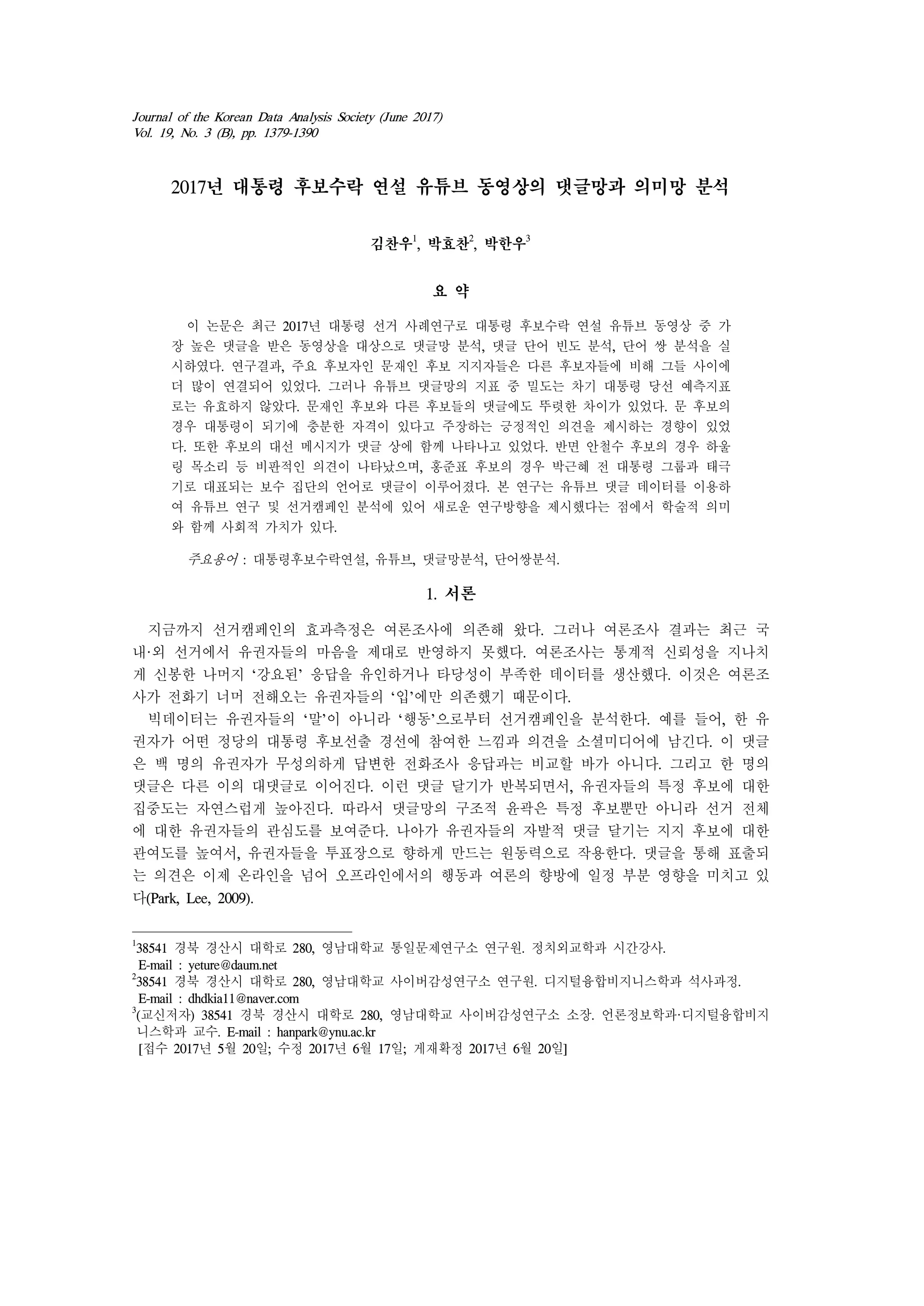 (교신저자) 38541 경북 경산시 대학로 280, 영남대학교 사이버감성연구소 소장. 언론정보학과·디지털융합비지