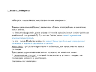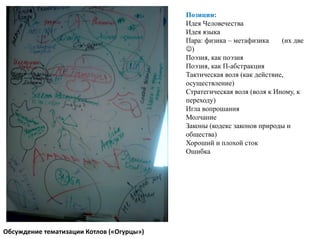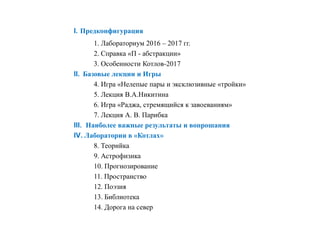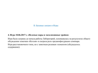 Документ представляет собой обзор лабораторного пространства, обсуждающего концепции мышления, мета-онтологий и культурных взаимодействий в контексте научных и философских исследований. Он включает в себя разбор проблем современности, таких как глобализация, кризисы и устойчивое развитие, а также предлагает новые пути для интеллектуальной организации общества. Автор исследует связь между поэзией, законами и человечеством в контексте мета-идей и концепций будущего.