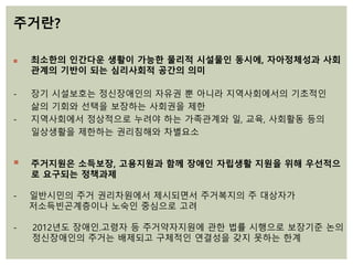 주거지원은 소득보장, 고용지원과 함께 장애인 자립생활 지원을 위해 우선적으