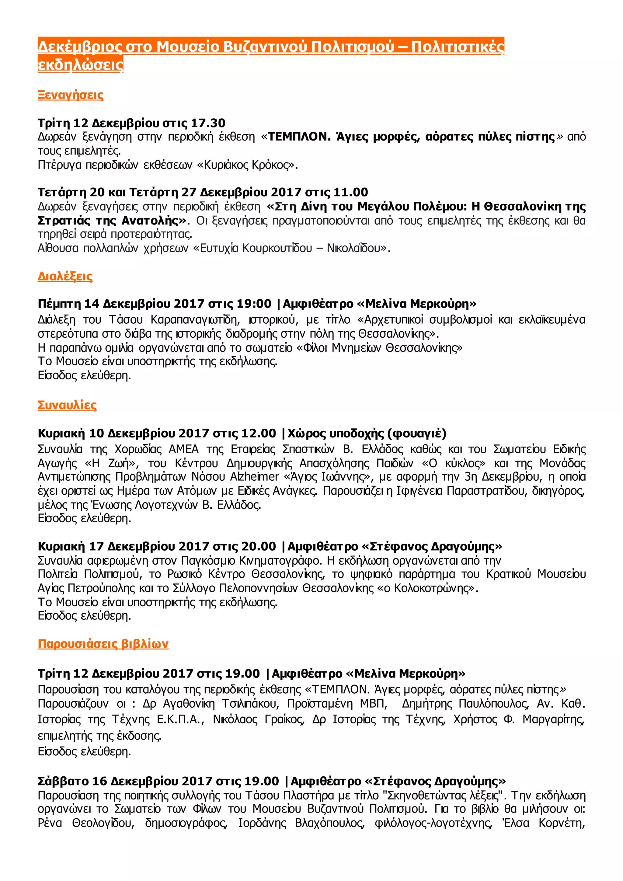 Δεκέμβριος στο ΜουσείοΒυζαντινού Πολιτισμού – Πολιτιστικές