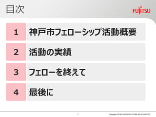 フェローを通じて得られたこと 0から1を作る経験を沢山させて頂いた 視野が広がり、チャレンジの幅が拡大! 短期間で沢山の方と出会い第二の故郷的存在に 職員の方や市民の方々の顔が浮かぶようになりました。 Copyright 2018 FUJITSU