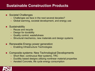 The document discusses cement-based composites as sustainable infrastructure materials. It notes societal challenges around global warming, development and energy use that cement composites can help address. Fiber-reinforced cement composites provide benefits like increased ductility, durability, toughness and energy absorption. They allow for thinner cross-sections, reduced steel reinforcement, and improved structural performance under service and extreme loads. The document outlines applications of fiber cement composites in infrastructure like tunnels, canals, water tanks, and precast wall panels.